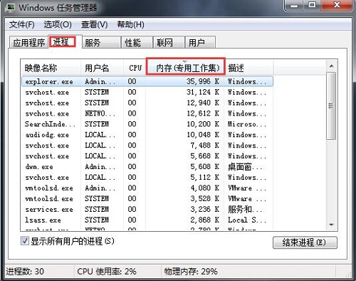 3、接着可以点击任务管理器上方的“进程”选项卡,然后再点击“内存”一栏,可以让系统显示软件占用内存大小来排列。在每一个软件进程右侧有一个描述,可以知道这个软件的中文名称。从这里可以看到当前电脑上是那些应用程序在大量使用内存,这样对自己的系统内存使用有一个初步的了解;