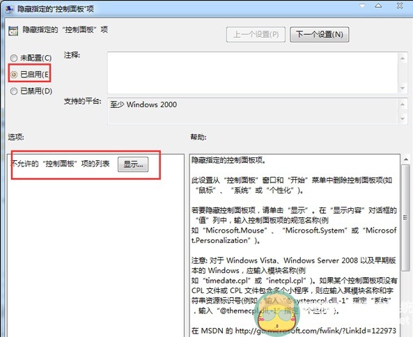 3、打开控制面板之后,在右侧的界面中打开“隐藏指定的“控制面板项”项”,在弹出的窗口中依次点击:已启用→不允许的控制面板程序列表中点击显示;