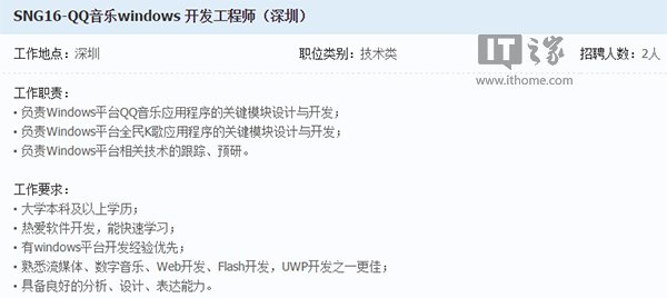 另外,同样值得注意的是,在另一则“QQ音乐Windows开发工程师”的招聘启事中,腾讯也提到了UWP开发,或许UWP版QQ音乐也正在计划中。
