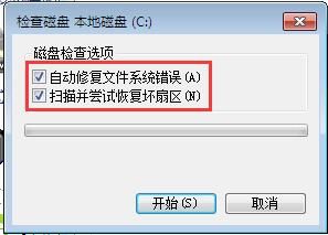③全选磁盘检查选项,然后点击开始,最后等待修复完成重启电脑即可,如图所示: