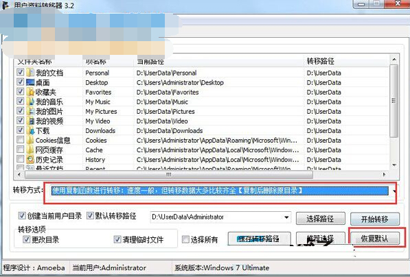 2、解压后打开工具,先选择你要恢复的文件夹,然后选择一下转移方式为“使用复制函数进行转移”(不容易出现文件损坏);