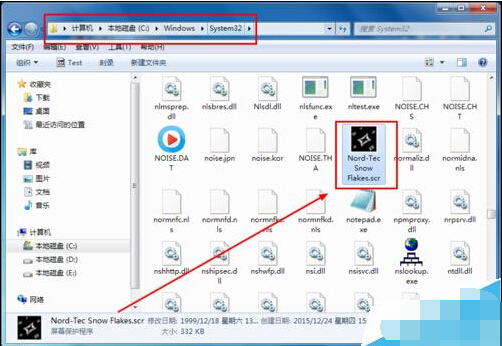 5、复制Nord-Tec Snow Flakes.scr到System32文件夹里。