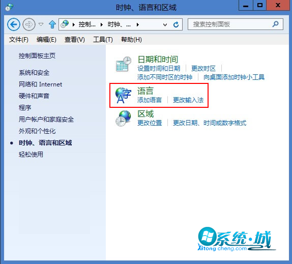步骤二:接着在跳出的时钟、语言和区域菜单中选择“语言”项。