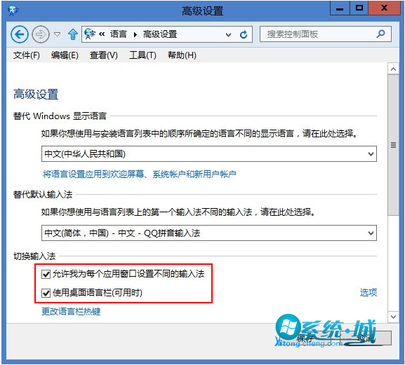 步骤四:最后勾选“切换输入法”下面的“允许我为每个应用窗口设置不同的输入法”和“使用桌面语言栏”两项。