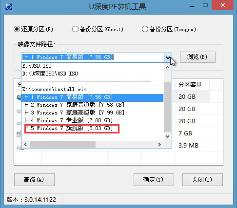 2、系统进入win8PE后会自动弹出深度pe系统中的系统安装工具,此时我们只要在“映像文件路径”上找到存放于U盘中的原版win7系统镜像包,安装工具就会自动读取并提取镜像文件中的安装文件,由于原版win7系统的版本选择较多,这里我们点击选择“5 windows 7旗舰版”做为安装,如图所示: