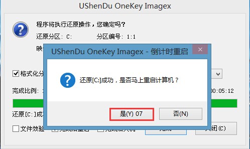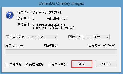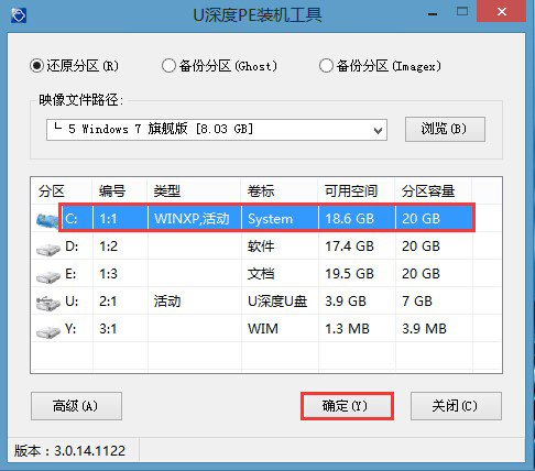 3、接着选择我们要安装的磁盘分区,默认情况下我们以C盘做为系统安装的最佳分区选择,然后点击“确定”,系统还会弹出提示框,再次点击“确定”即可,如图所示: