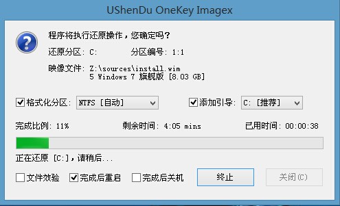4、此时就系统安装工具会将原版win7系统镜像包释放到所选择的分区当中,释放完成后所出现的提示重启窗口中可点击确定或者等待10秒让电脑重新启动,如图所示: