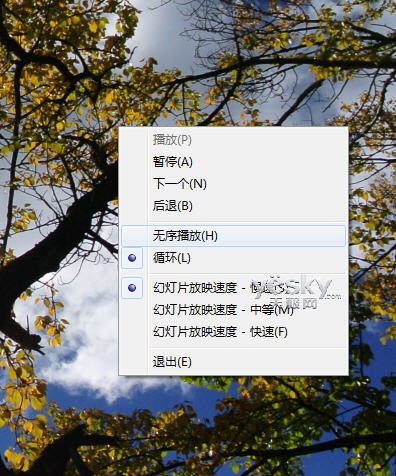 图示:鼠标右键单击Win7幻灯播放画面 弹出播放控制菜单