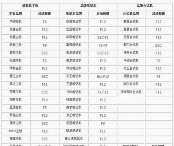 2、在U盘启动之时,如下送上不同品牌主板的快捷启动BIOS键值;