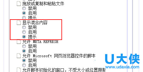 c、选择提示,网页使用非安全内容时将提示您。根据自己的需要选择完成之后,点击确定进行保存即可。