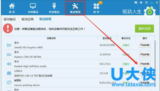 1、下载安装驱动人生最新版本,点击驱动管理(如下图),一键检测查看,可查看到你本机的声卡驱动,点击右边驱动卸载,即可一键彻底卸载干净,然后点击立即重启即可。