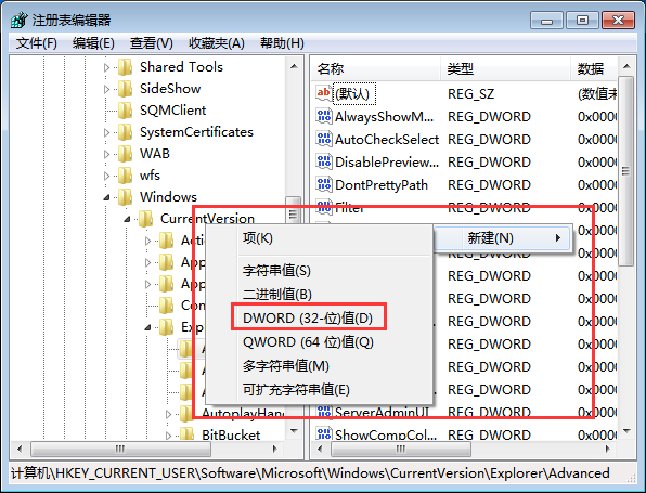 HKEY_CURRENT_USERSoftwareMicrosoftWindowsCurrentVersionExplorerAdvanced