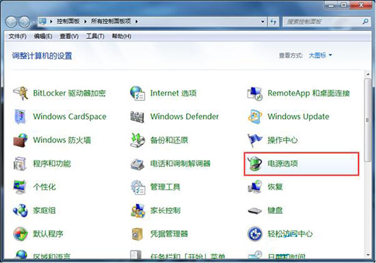 2、将控制面板的查看方式修改为“大图标”,然后点击下面的“电源选项”;如图所示: