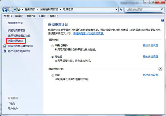 3、在电源选项的左侧点击“创建电源计划”;如图所示: