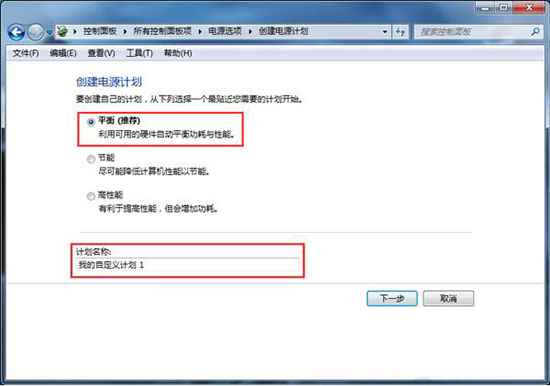 4、选择好电源计划的性能、名称,然后点击下一步;如图所示: