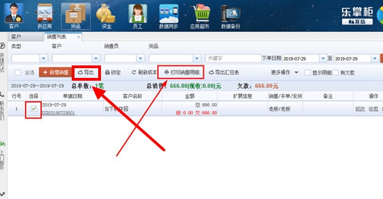 2、用户可以在销售列表中看到每个单据、日期与具体金额,选中想要导出的销售单,点击上方红框标注内的“导出”选项,如下图所示: