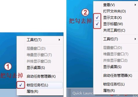 3、右击任务栏,取消勾选锁定任务栏,将任务栏解锁。接着在 Quick Launch 的位置右键,将显示文本和显示标题的勾去掉。