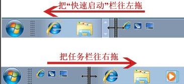 4、然后我们把快速启动栏往左拖到不能再拖的位置。把任务栏往右拖,快速启动栏自动就到了最左边。