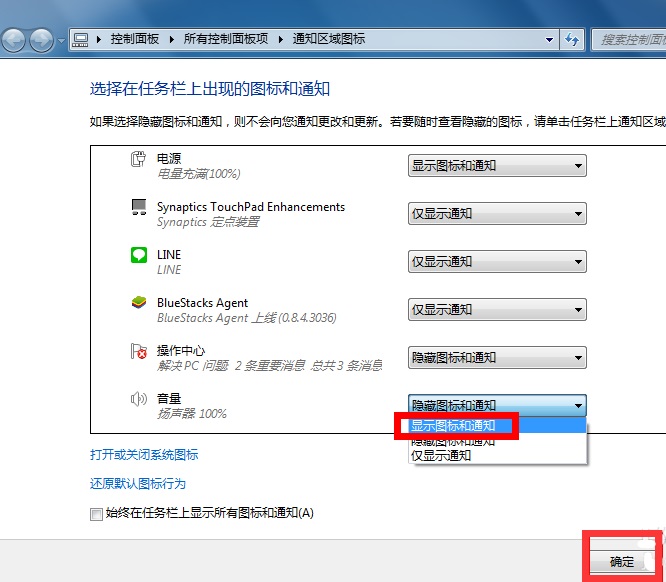 2 、将音量设置改为“显示通知和图标”,点击确定