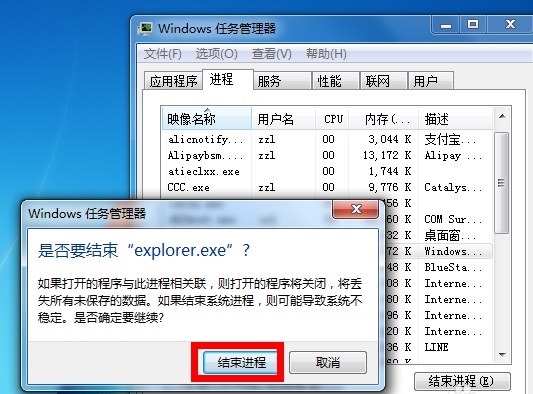 5、系统弹出确认菜单,结束进程。图标消失别担心