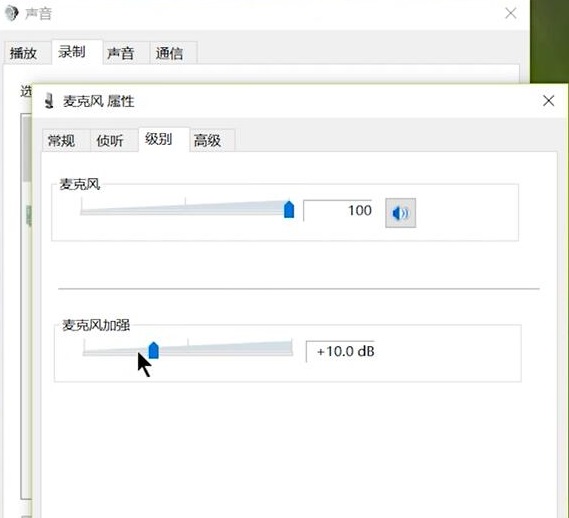 4.切换到级别选项,将麦克风声音和麦克风加强设置为最大。
