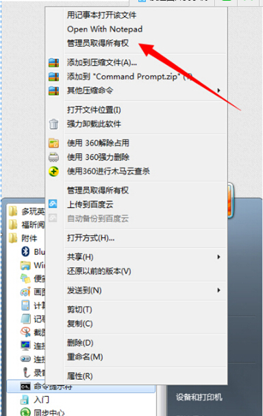 2.打开所有程序里的附件,右键命令提示符,点击管理员取得所有权;