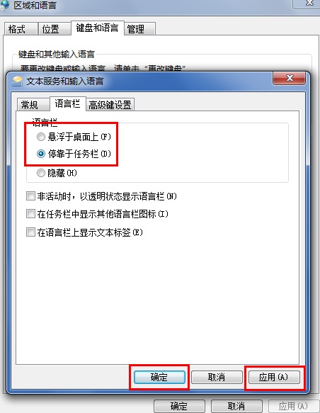 7、将语言栏的状态改为“悬浮于桌面上”或者“停靠于任务栏”,然后点击右下方的“应用”和“确定”按钮,这样就可以看到输入法的图标了