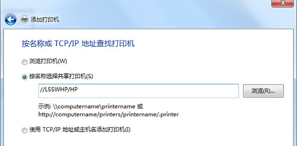 按名次选择共享打印机,输入“//LSSWHP/HP”,单击下一步