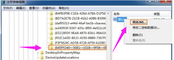 如果在右侧窗口,右键点击“默认”字符串值打开菜单,选择“修改”,或者直接双击打开
