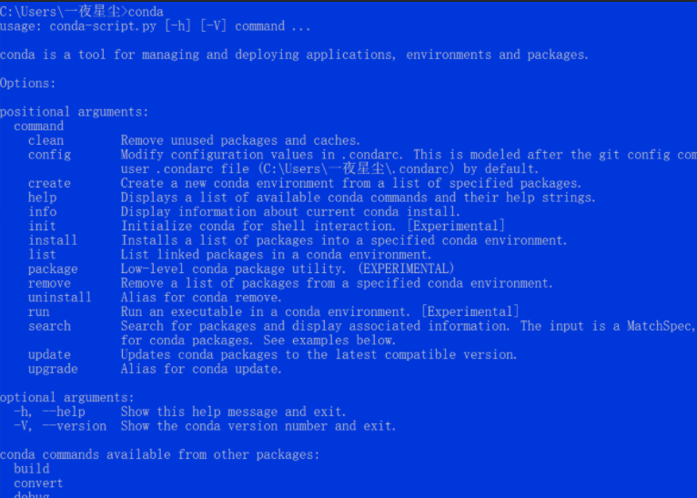 6、重新启动运行命令框,再次输入conda,出现完整显示,说明整体安装完成。