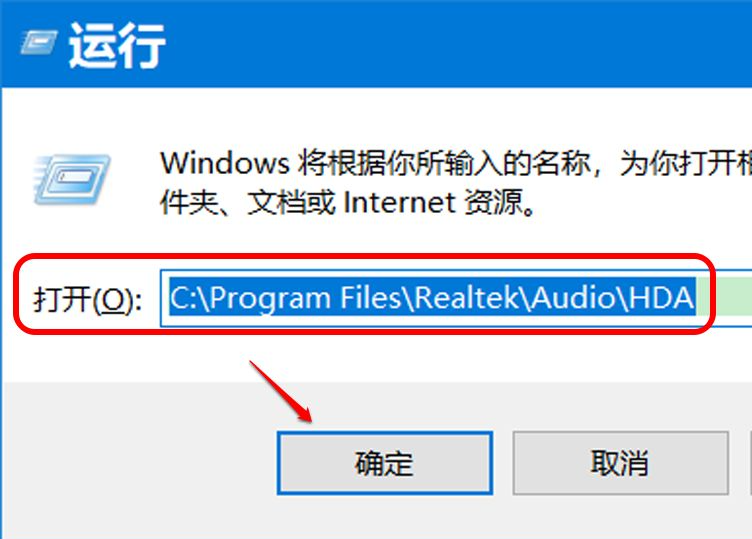 3、打开运行窗口,在对话框中输入:C:Program FilesRealtekAudioHDA,点击确定或按下键盘上的回车键。
