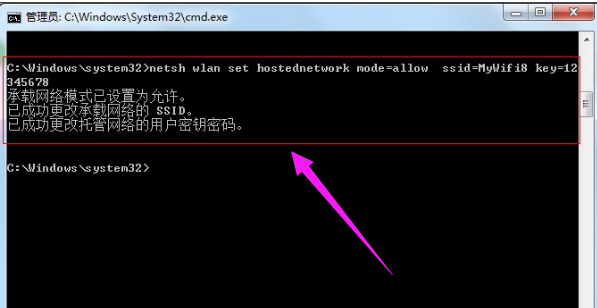 netsh wlan set hostednetwork mode=allow ssid=MyWifi8 key=12345678