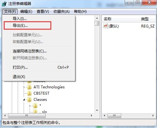 3、然后点击菜单“文件-导出” (导入注册表时也是按照以上步骤,然后在这个界面中选择“导入”);如图所示: