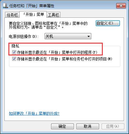 2、然后在【开始】菜单选项卡下,隐私一项中,勾选 储存并显示最近在开始菜单中打开的程序选项,确定;