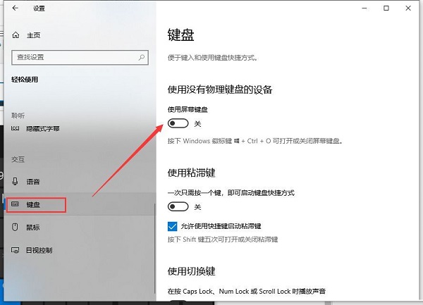方法二:同时按下键盘快捷键【win+i】或者在开始菜单里打开设置,找到【轻松使用】选项打开。接着左侧找到【键盘】选项展开,右侧就可以看到屏幕键盘的开关,打开即可。