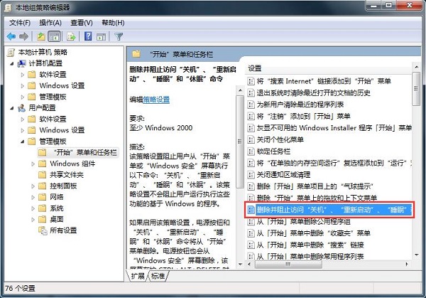 3、在右侧找到“删除并阻止访问关机、重新启动、睡眠和休眠命令",并双击打开;