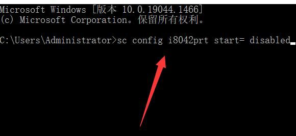 5、管理员命令提示符窗口,输入并按回车执行以下命令:sc config i8042prt start= disabled,即可禁用笔记本键盘