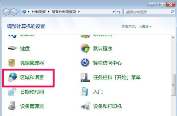 1、修改区域语言,是一种比较常用的方法,先从开始菜单中打开控制面板,把视图查看方式设置为“大图标”,接着找到“区域和语言”这一项。