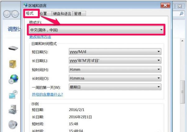 2、进入区域和语言窗口后,先选择“格式”这个选项卡,在这个界面,把格式设置为“中文(简体,中国)”。