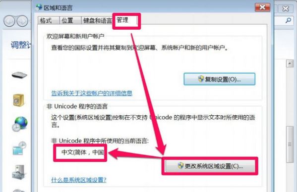 4、再打开“管理”这个选项卡,在非Unicode程序语言下选项下,点开“更改系统区域设置”按钮,设置为“中文(简体,中国)”,确定。