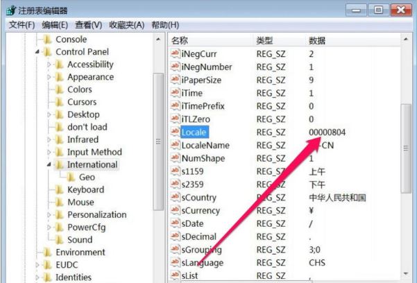 3、先去试试软件是否恢复正常,如果还不行,再依次打开HKEY_CURRENT_USERControl PanelInternational这条路径,在International的右侧窗口,找到Locale这一项。