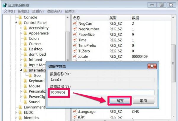 4、看看其后面的值是否为00000804,如果不是,双击此项,打开修改窗口,将其值改为这个值。