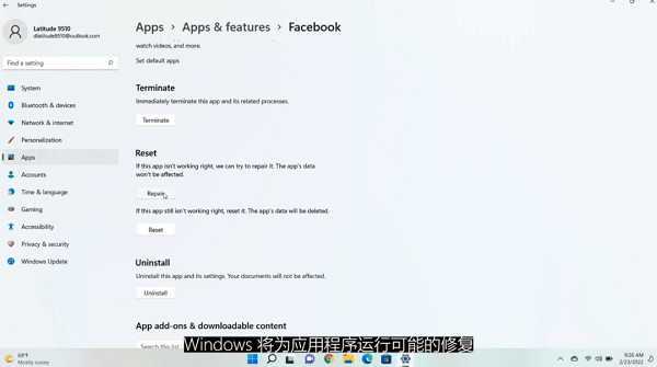 接下来在“重置”下,点击 修复,Windows 将为应用程序运行可能的修复。