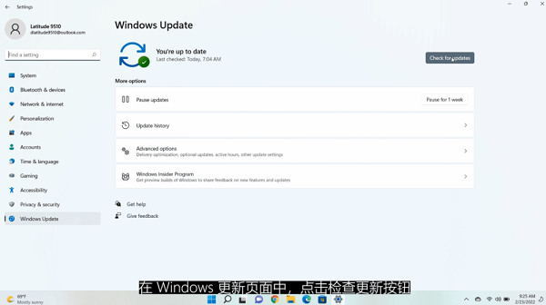 在 Windows 更新页面中,点击检查更新按钮。Windows 将查找并下载任何待办的更新。
