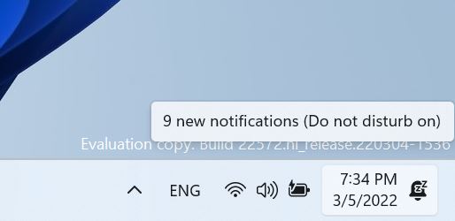 在 Build 22557 中宣布的焦点更改的基础上,我们更新了“请勿打扰”设置为打开时通知中心的图标。