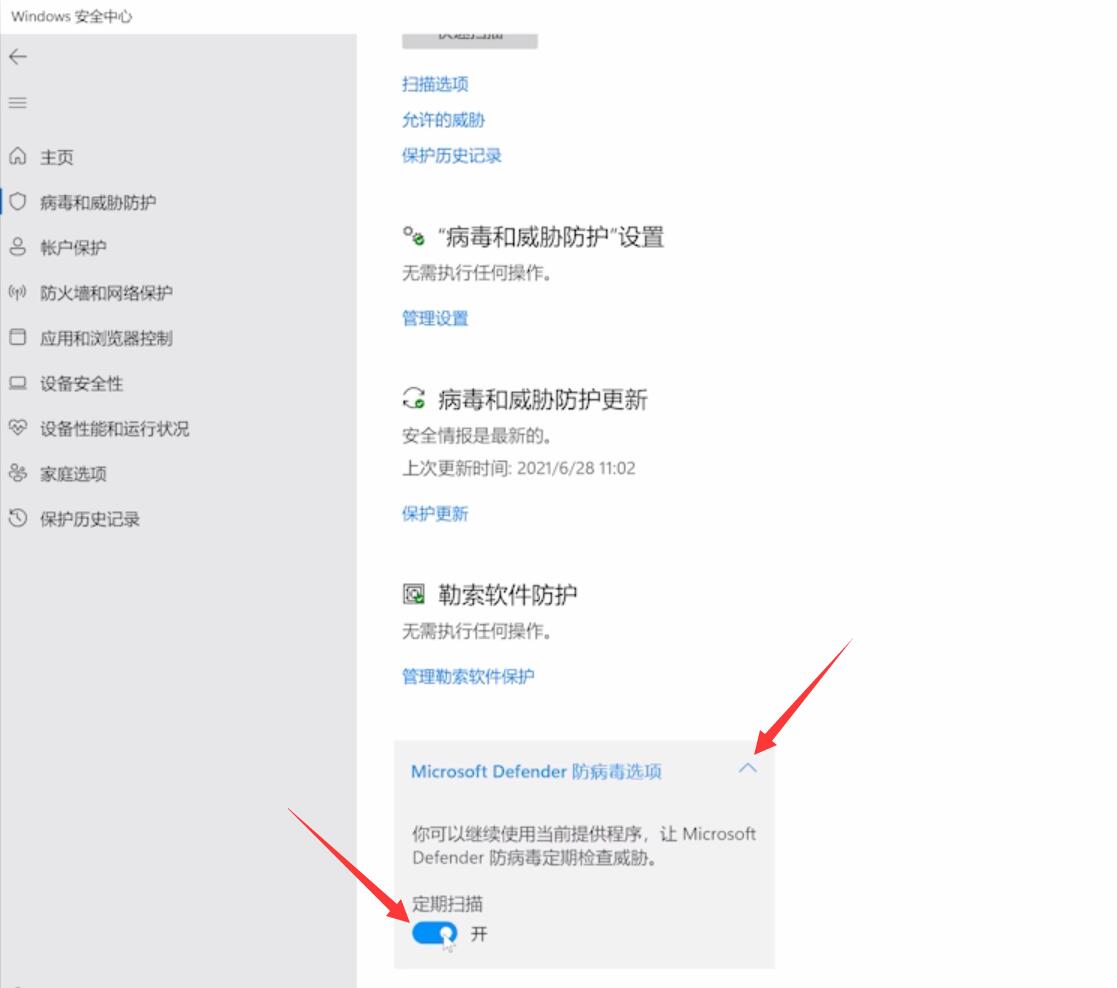 4、展开Microsoft Defender防病毒选项,开启定期扫描功能。