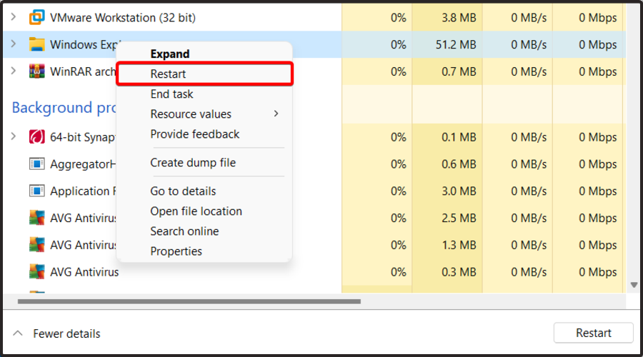 在打开的窗口中,右键单击Windows 文件资源管理器并选择重新启动它。