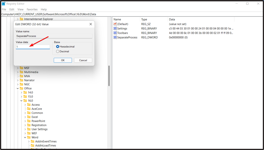 将新弹出窗口重命名为SeparateProcess。双击已创建的文件并将值数据从0更改为1。