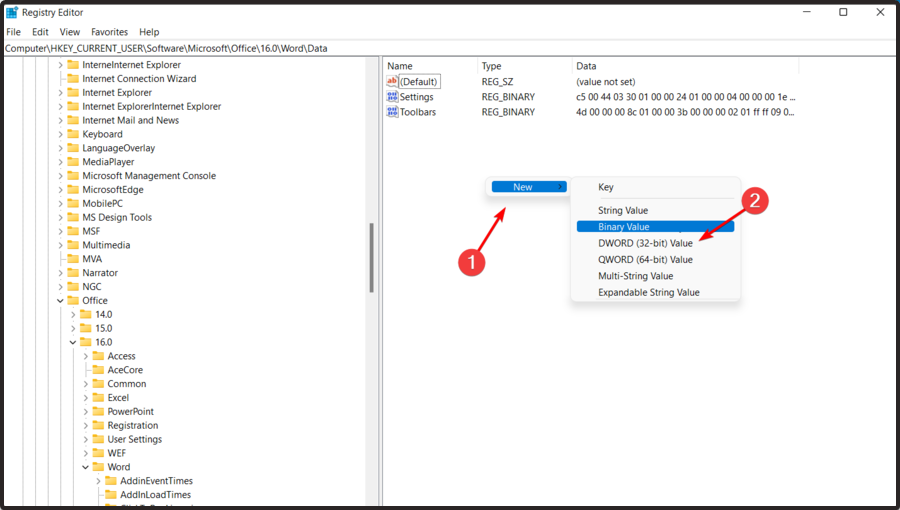 单击右侧窗口,然后选择New,然后选择DWORD (32-bit) Value。