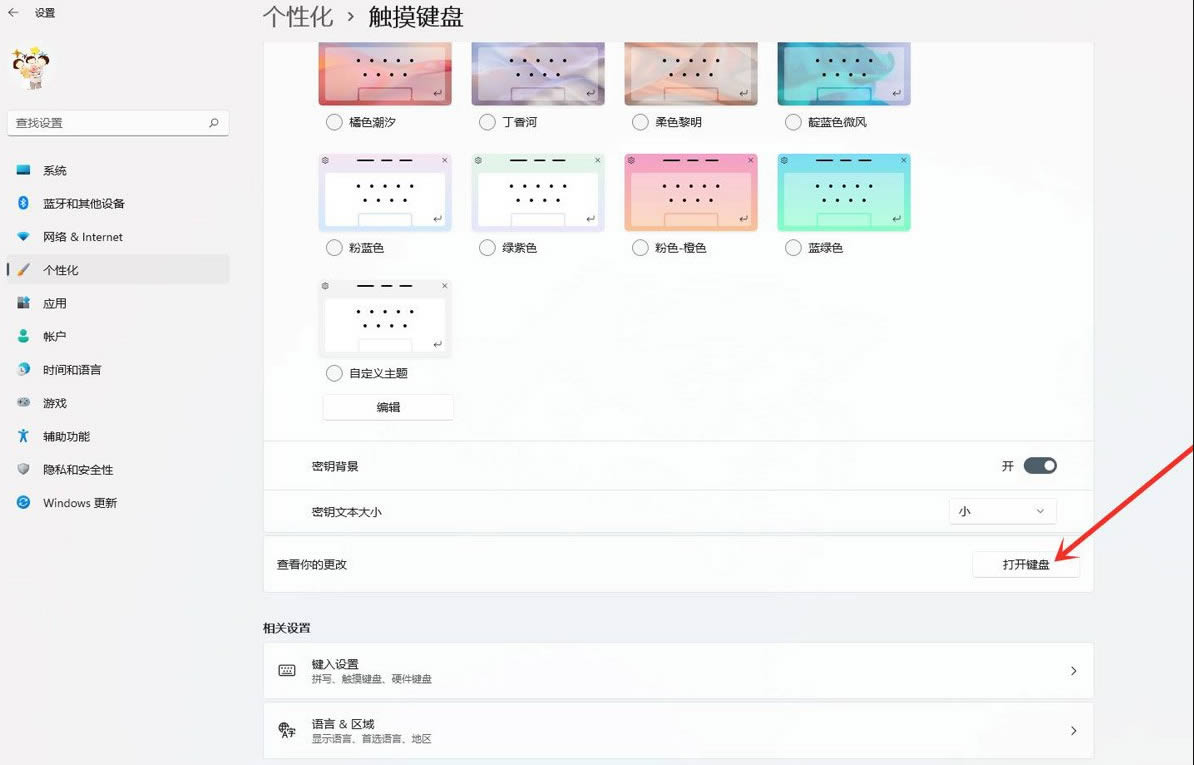 2、设置窗口,左侧点击个性化,右侧点击触摸键盘(主题、大小)。